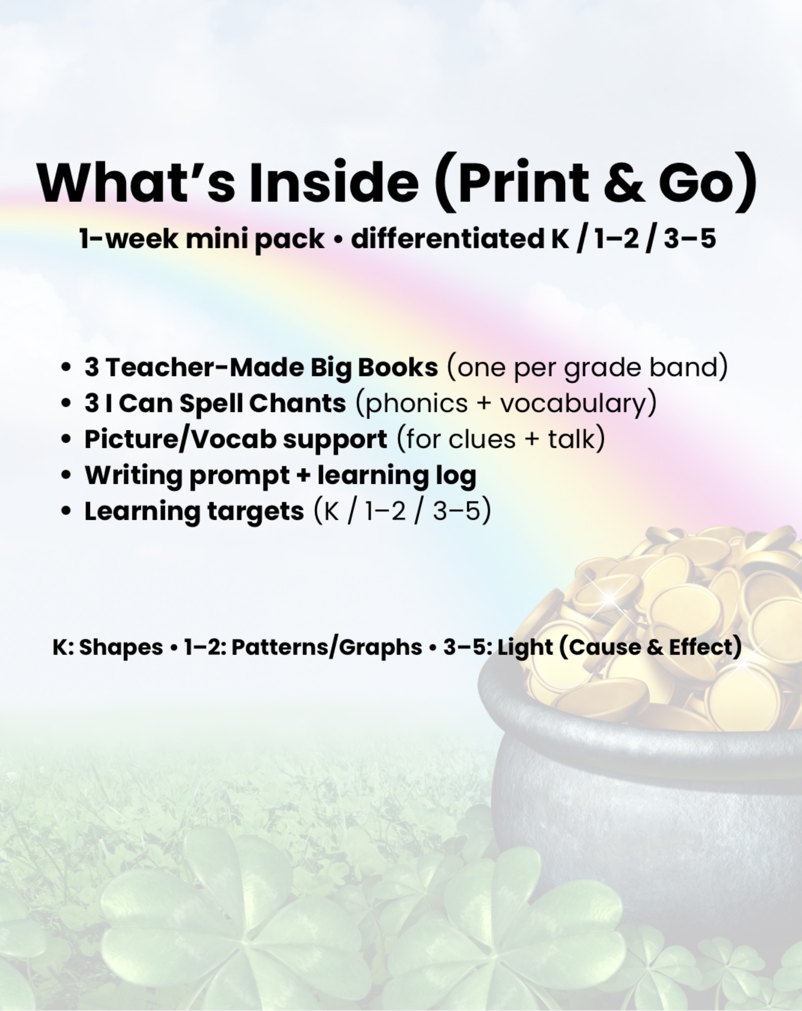 – Kindergarten: The Leprechaun’s Shape Hunt (shape vocabulary + oral language)